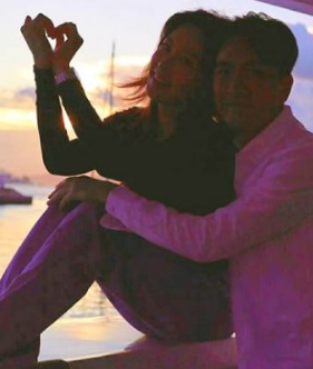 靓汤也罕见PO出与马国明出海欣赏日落的合照,照片虽然背着夕阳有点阴暗,但可见马国明一手在后环抱她的腰,靓汤则依偎着男友,双手摆出爱心手势,非常甜蜜!