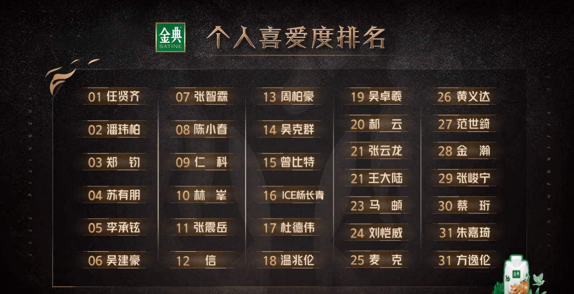 在个人喜爱度方面,节目最终排名分别是:任贤齐、潘玮柏、郑钧、苏有朋、李承铉、吴建豪、张智霖、陈小春、仁科、林峯。
