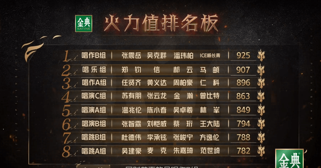 张震岳组《思念是一种病》获第一;郑钧组《私奔》舞台第二名;任贤齐组《伤心太平洋》舞台第三;苏有朋组《红蜻蜓》舞台第四;温兆伦组《一生何求》第五,张智霖组《我还年轻我还年轻》舞台第六名;杜德伟组《拯救地球》舞台第七名;吴建豪组《爱的主打歌》舞台第八名。