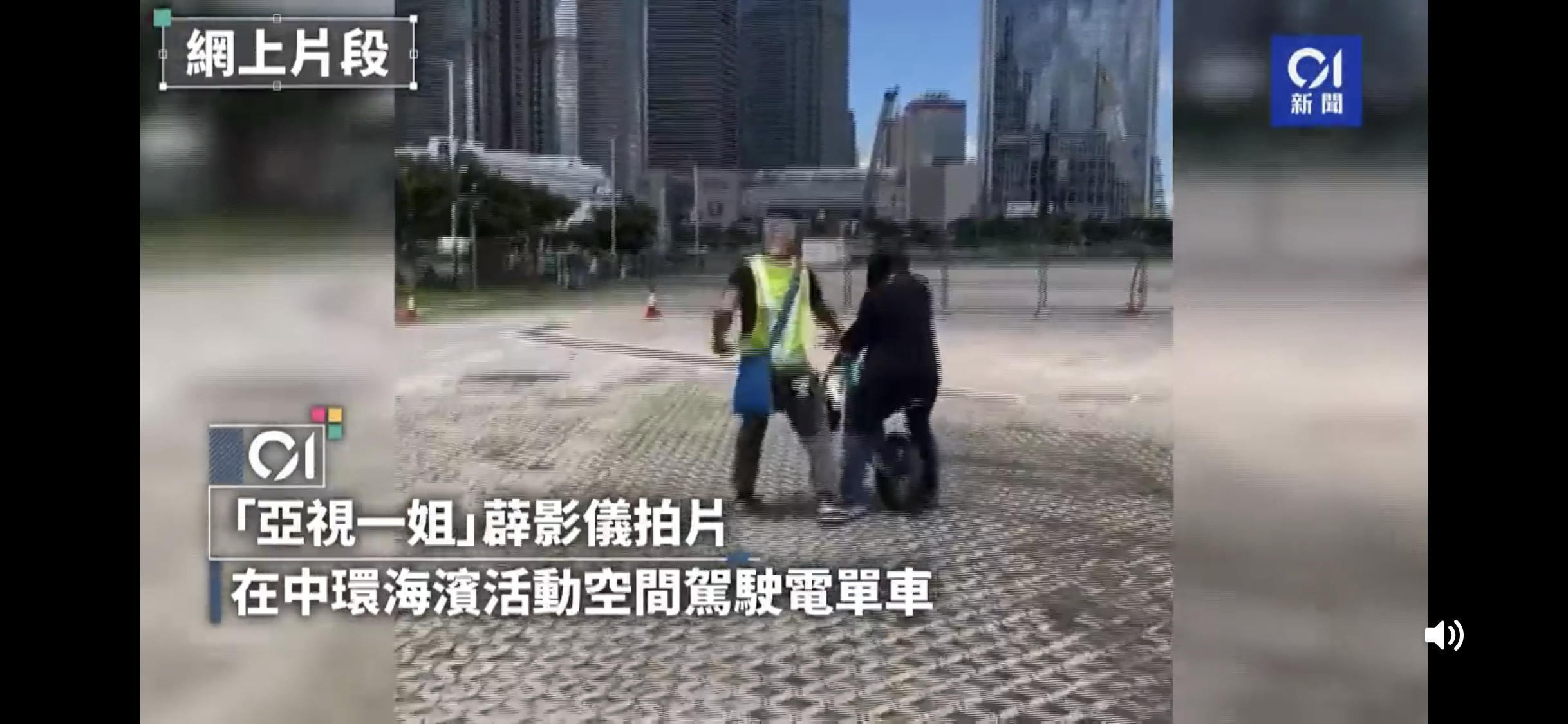 阿仪被指无戴头盔在中环海滨无牌驾驶小型电单车,被人拍片放上网后,警方展开调查,随后今日于跑马地以4罪拘捕她。从影片可见,阿仪驾驶一辆小型电单车,在旁有一名身穿反光衣的男子教她驾驶方法,曾一度扶住电单车把手协助。