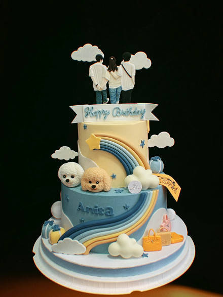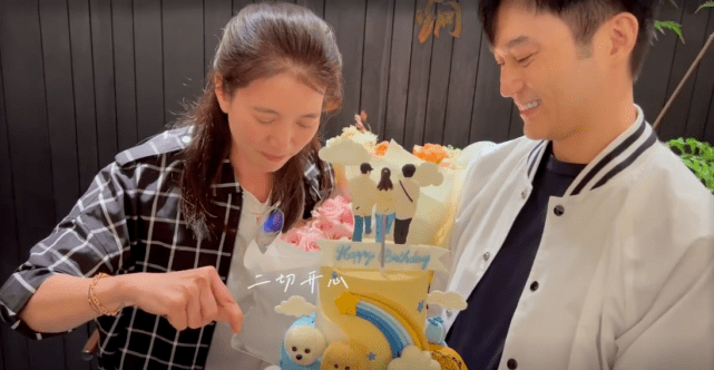 片中可见身为寿星的她手捧鲜花,笑得非常开心,当见到特别准备的生日蛋糕时,脸上的惊喜之情更是流露无遗;蛋糕上除了有他们一家3口的造型娃娃之外,还有两只爱犬阿金和阿喜的卡通造型娃娃,十分精致。