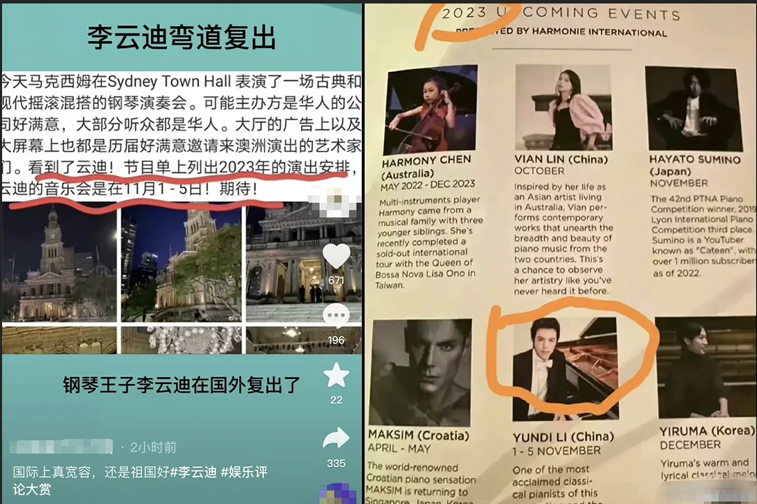 在消失11个月后,有来自澳洲的网民近日爆出李云迪复出消息,指表示自己在观看马克西姆的演出时,发现了2023年的演出节目单上有李云迪,日期落在11月1日至5日。