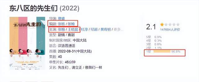 《东八区》是在9月19日播出大结局,刚播出时,该剧就因为剧情低俗、张翰油腻、涉嫌侮辱女性等原因遭到人民网批评,开播10天就有4万人给《东八区的先生们》打出了2.2的低分,成为了2022年年度最低分。如今评分更是掉到2.1,堪称大烂剧。