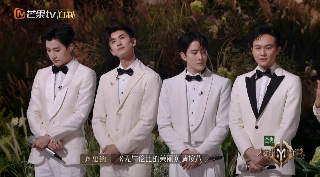 从整个舞台呈现,张智霖、张云龙、mike以及范世錡全员身穿白色西装,深情演唱《无与伦比的美丽》,将浪漫的氛围烘托到了极致,一直到歌曲快结束时,张智霖说起与袁咏仪的60岁之约,向大家宣布今天要提早10年补办婚礼,他接着喊:“袁咏仪!你就是我心中无与伦比的美丽!”