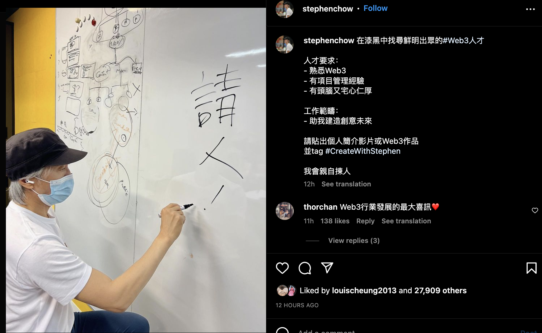 星爷的第一个贴文便是招聘专才,还引用经典电影台词“在漆黑中找寻鲜明出众的#Web3人才”,让他的铁粉和网友惊喜朝圣,不少网友十分惊喜留言:“星爷多多更新日常照片啊”、“终于等到啦”,