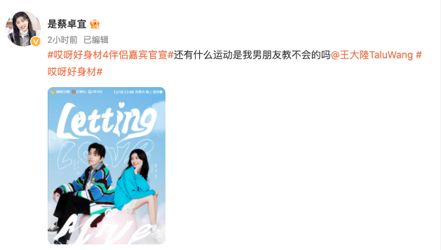 两人在贴文中还标明是节目“伴侣嘉宾官宣”,不藏了直接大方认爱,两人突如其来的认爱,受到广大粉丝的祝福。