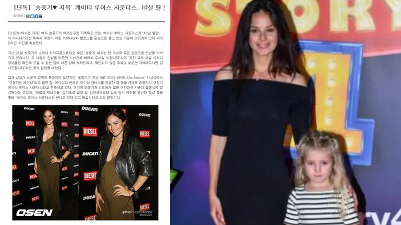 随着宋仲基认爱,网民接二连三爆料,除了指女友就是英国前演员Katy Louise Saunders,韩网论坛上今天还传出凯蒂已有10岁大女儿,一头金发模样可爱俏皮,宋仲基再婚直接当现成爸,韩媒还挖出凯蒂疑似怀孕时的照片。