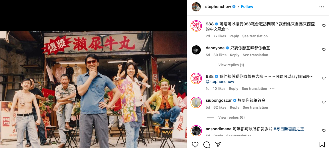 周星驰2023年于IG首发文,帖出电影《食神》剧照写下:“新一年,有什么愿望,通通讲出来!”,让众多粉丝前来朝圣,不少港台艺人都留言,蔡思贝许愿要当星爷手下,胡杏儿则说“想你成家立室生個小星星”、Bob林盛斌则希望星爷可以回复他的留言。