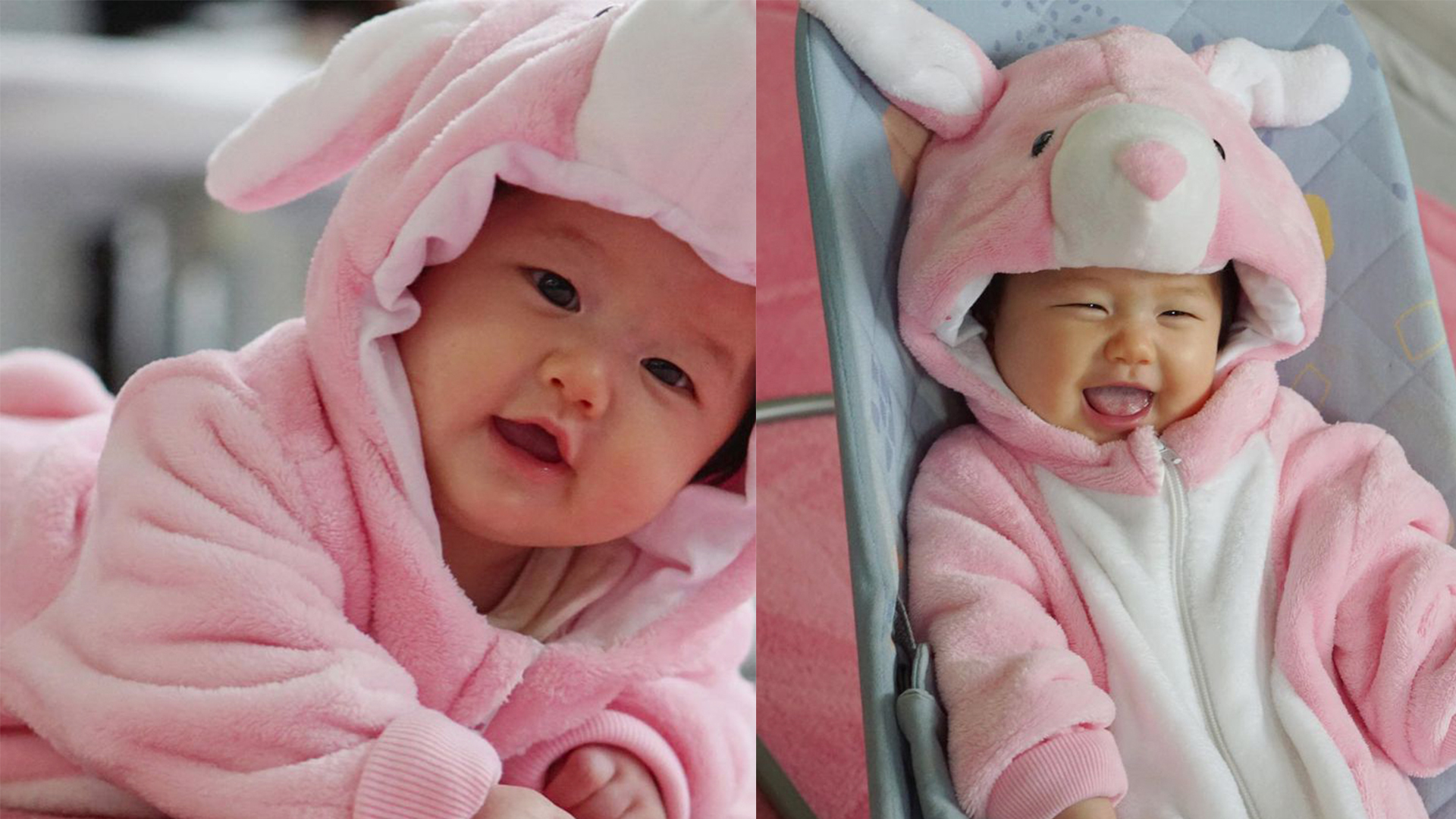 踏入兔年,锺嘉欣为爱女化身成可爱小兔兔,穿上有对长长兔子耳的粉红色毛毛连身衣,化身“小兔女”贺年。