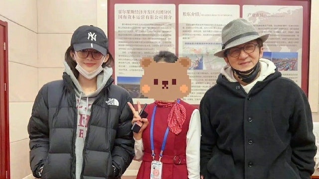 网上晒出的照片中,成龙身穿黑色棉服,戴着帽子和眼镜,双手插在裤兜,娜扎穿着长款羽绒服,戴着棒球帽,化着淡妆。