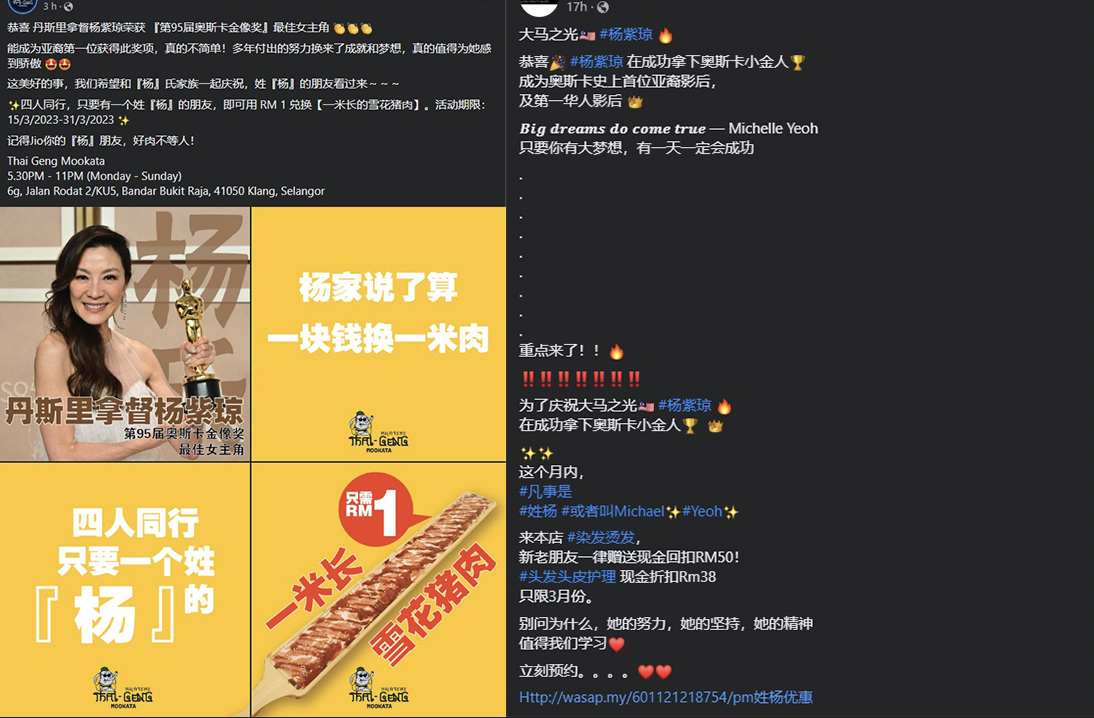 另有一间烧烤也在本月15日至31日期间,限定4名同行者中,只要其中一人姓杨,就可用1令吉兑换一块“一米长的雪花猪肉”。