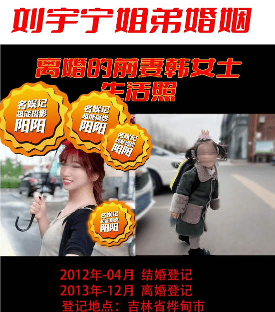根据媒体报道,狗仔“超能摄影阳阳”爆出刘宇宁曾经有一段姐弟婚姻,两人还有一个女儿,女方姓韩,还暴露了前妻与女儿的生活照。狗仔更称两人是在2012年4月结婚登记,婚姻仅维系了一年,2013年12月就已登记离婚。结婚登记地点是吉林省桦甸市。