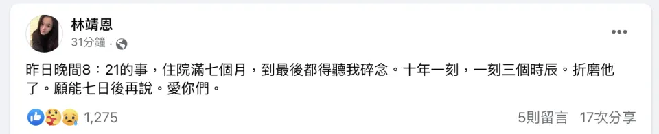 李坤城去年才传出病重消息,但李坤城当时出面驳斥谣言,没想到事隔一年又传出离世消息,林靖恩昨晚在脸书发文证实“昨晚(8日)晚间8:21的事,住院满7个月,到最后都得听我碎念。十年一刻,一刻三个时辰。折磨他了。愿能七日后再说。爱你们。”