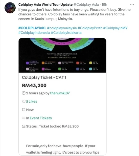 推特账号“Coldplay Asia World Tour Update@Coldplay_Asia”截图及发文谴责黄牛行径:直斥:“如果你没意愿看演唱会,那就别买。你知道Coldplay粉丝等了多少年才等到他们来马开唱吗?”
