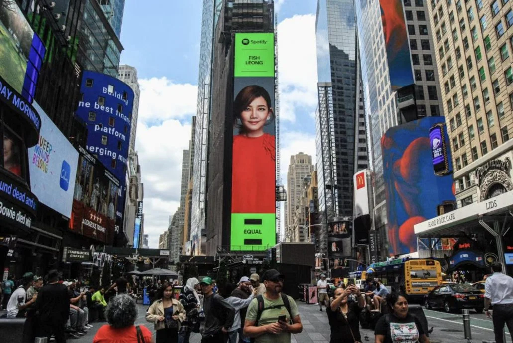 梁静茹成为国际数字串流平台Spotify“EQUAL” 歌单的人物,她昨午在脸书分享自己登上纽约时代广场巨型LED屏幕的照片,并留言“谢谢Spotify”。