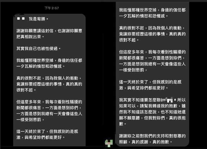 她坦言性骚新闻曝光后,宥胜传讯向她道歉,她第一时间双手在发抖、不敢点开,现在的她,只希望“能不要再见就别见了比较好”。而宥胜道歉简讯上头写着“其实我自己也被性侵过。我能懂那种世界空掉,身边的信任都一夕瓦解的愤怒和恐惧感。真的很对不起,因为我个人的冲动,竟让你要经历这样的事情,真的真的很对不起。”意图以自身经历模糊焦点,被网民炮轰“这难道是性骚别人的借口?”
