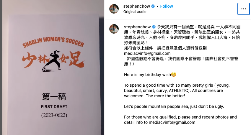 6月22日是星爷周星驰61岁生日,他在IG公开自己的生日愿望,透露新片《少林女足》即将开拍,公开招募不同国籍的年轻美女加入海选,并强调要天然美女,谢绝P图造假!这个帖子甚至吸引了视后胡杏儿,留言想报名:“一定要年轻貌美呀?生过3件(个)得唔得(行不行)?”