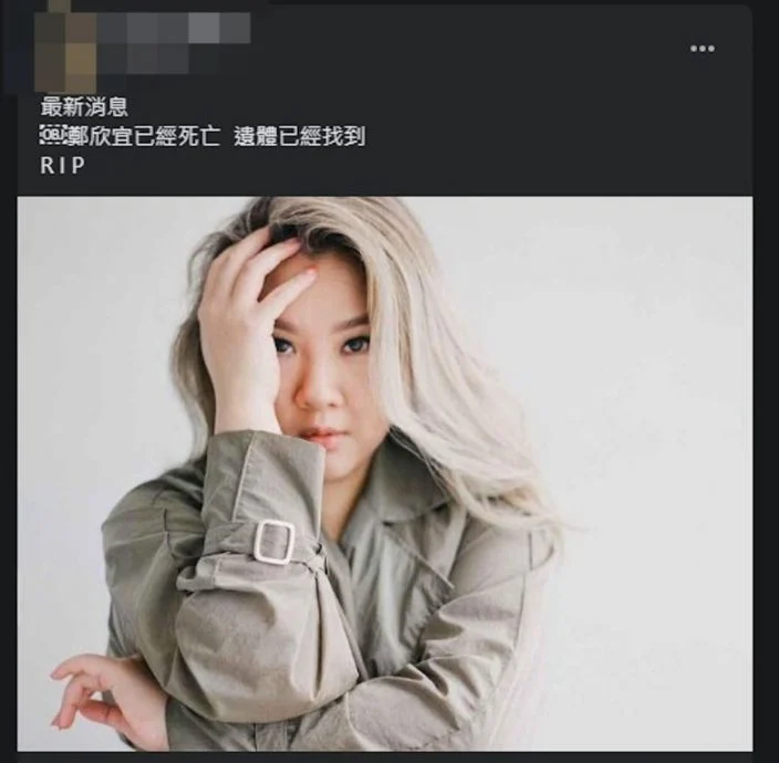 近日,情况再掀热议,因为有网友在YT频道上以:“郑欣宜遗体找到,香港警方公开详细经过”为题,传出郑欣宜的“乌龙死讯”,在陆网上掀起讨论声浪。然而,该专页并没有上载任何消息的来源及真伪,随后更把该帖文删除。