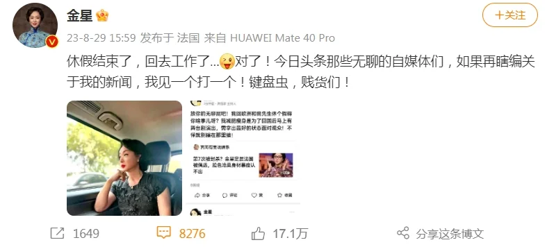 金姐解释她和丈夫正在欧洲度假,而且因工作原因减肥瘦身,“不懂就别在那里瞎编!”她还在相关帖子中上传一张自己侧脸近照,直言:“今日头条那些无聊的自媒体们,如果再瞎编关于我的新闻,我见一个打一个!”