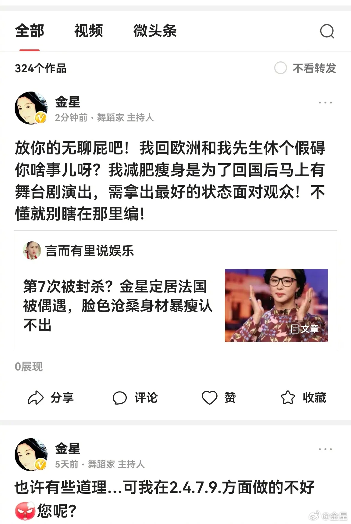 金星昨天又在社媒上更新动态,透露有自媒体称“第七次被封杀?金星定居法国被偶遇,脸色沧桑、身材暴瘦认不出”,让她忍不住回应并怒斥:“放你的无聊屁吧!”