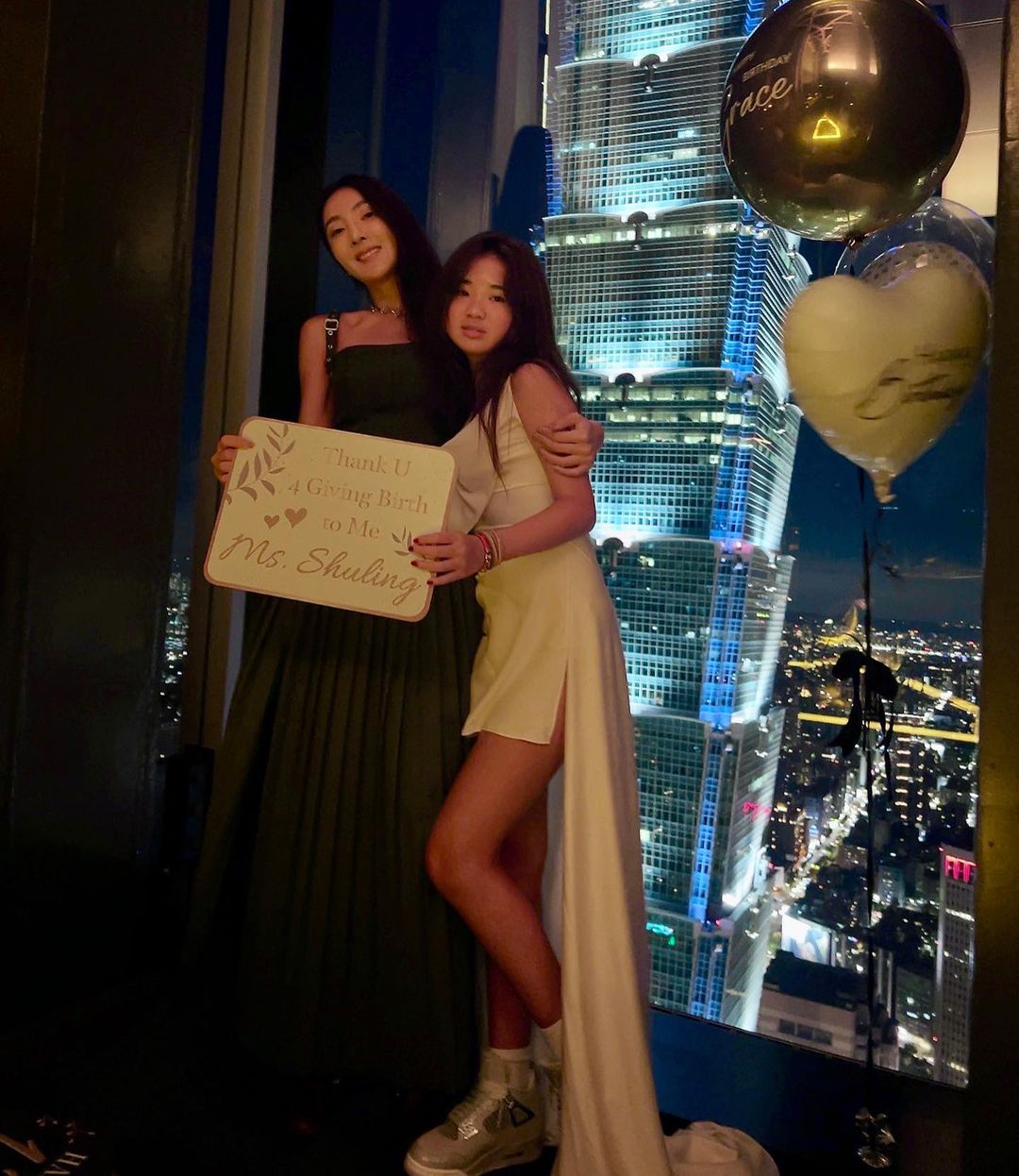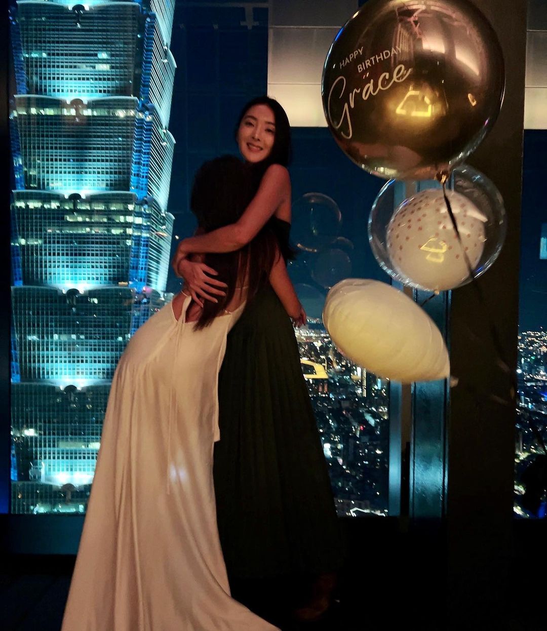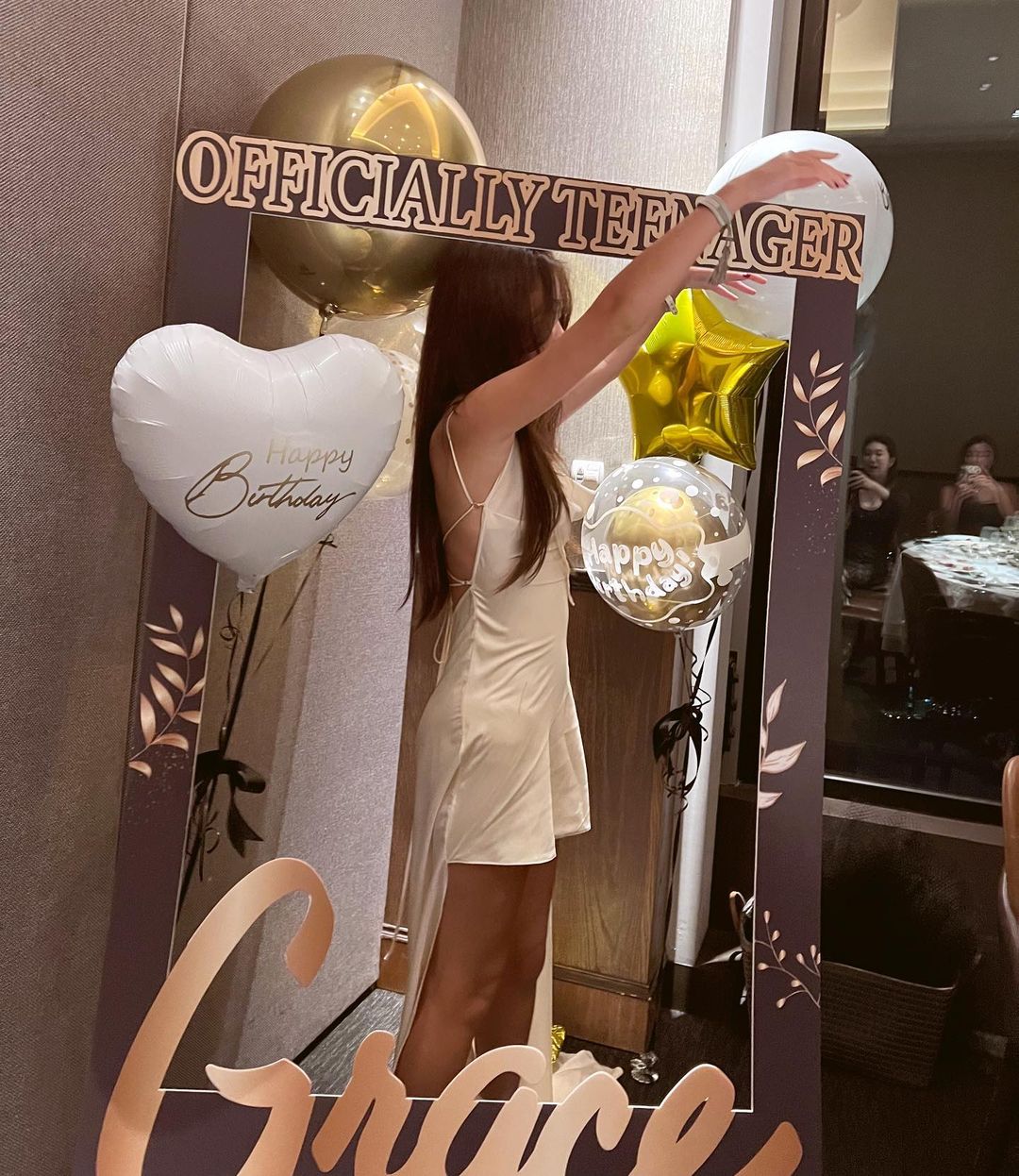吴速玲帮爱女在可以看到101场地庆生,用心地摆上了装饰气球,Grace换上白色露背小礼服亭亭玉立,她的好闺蜜们都受邀来一起同欢。