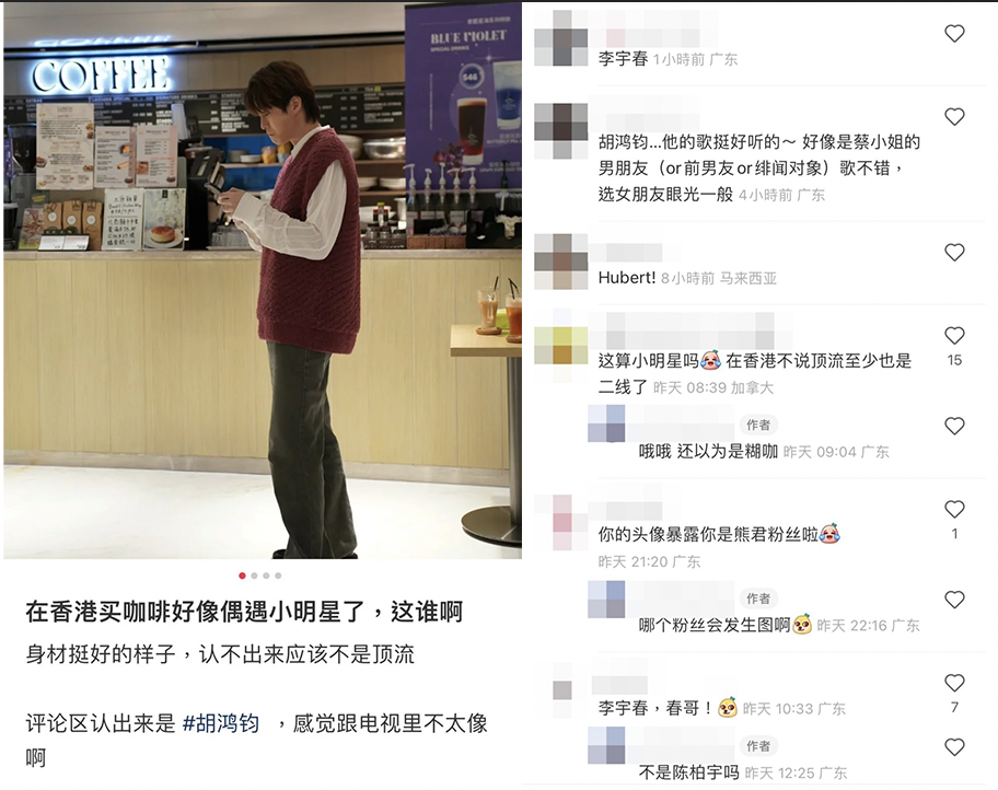 当日胡鸿钧独自站在咖啡店柜台前低头看手机,期间曾抬头瞪大眼双眼发呆;结果,评论区不少人还是认出来他是胡鸿钧,但表示感觉跟电视里不太像,不过,竟有网民误认了他是李宇春。
