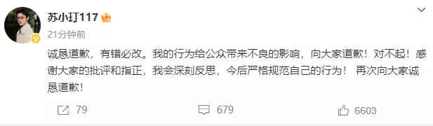 苏小玎的随地小便视频被狗仔“阿飞”公开后,瞬间就冲上热搜,苏小玎在1小时后发文道歉,指自己会严格规范自己的行为。