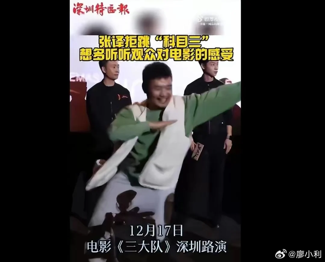 张译到深圳宣传电影《三大队》时,台下一名观众突然要求合跳《科目三》,张译当场拒绝这个跳舞的要求,表示“闲暇的时候可以陪大家玩”,张译认为要将重点放在电影上。