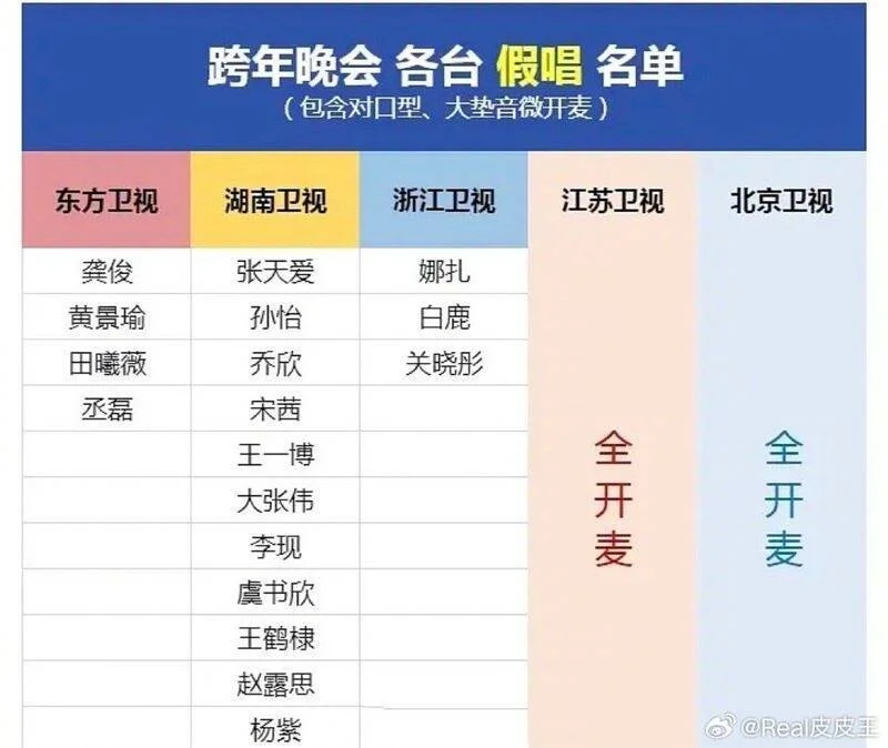 网民列举的5大晚会包括:东方卫视、湖南卫视、浙江卫视、江苏卫视、北京卫视,除江苏卫视、北京卫视全开麦之外,其馀3台都被指有对嘴或者垫音。列表中出现的除了演员跨界唱歌的之外,让人意外的是从韩团UNIQ出身的王一博、f(x)宋茜、《青春有你》亚军虞书欣皆榜上有名。很多网民还直呼失望:“选秀节目出道的,甚至有发表过专辑或单曲的,竟然也是假唱。”
