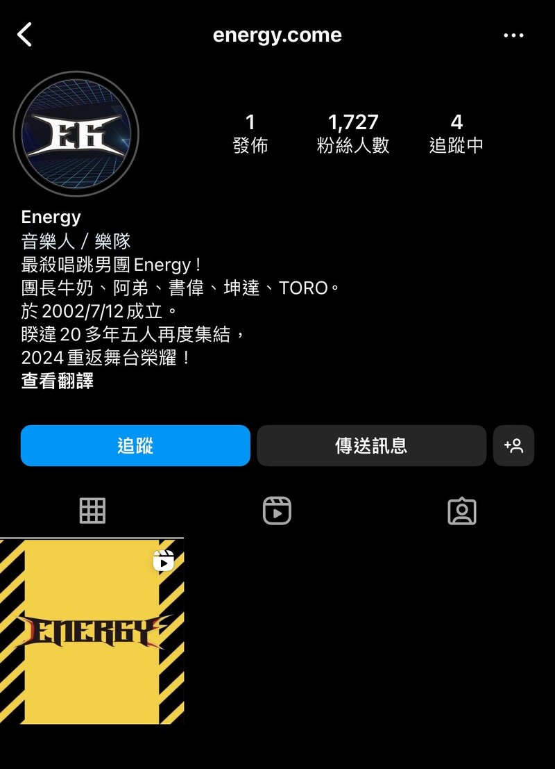 由坤达、叶乃文(牛奶)、萧景鸿(阿弟)、郭苇昀(TORO)和张书伟组成,当年红极一时受到歌迷喜爱的Energy今天在IG写道:“We are back”,自介上写着:“最杀唱跳男团Energy!团长牛奶、阿弟、书伟、坤达、TORO,于2002/7/12成立。暌违20多年5人再度集结,2024重返舞台荣耀!”消息曝光后,也引起热议。
