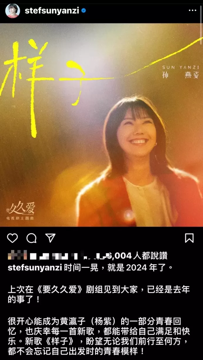 遭到妹妹疑似控诉之后,孙燕姿始终沉默以对,今为宣传搭配中国电视剧《要久久爱》新歌《样子》难得发文,表示很开心能成为剧中角色黄瀛子(杨紫)饰演的一部分青春回忆,“也庆幸每一首新歌,都能带给自己满足和快乐。”
