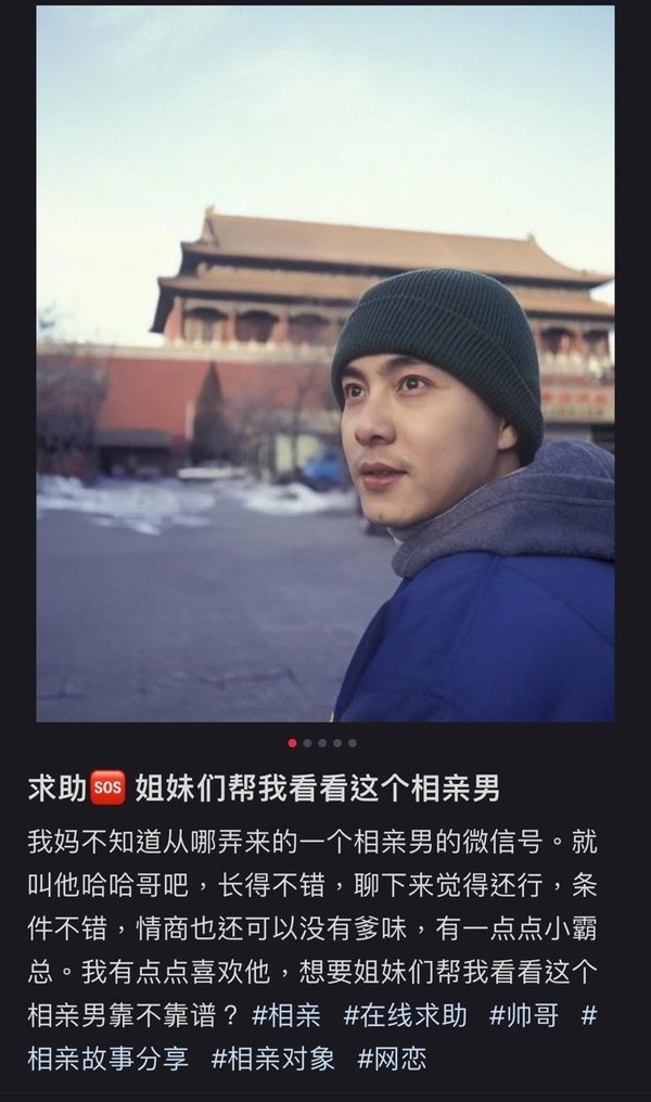 据一位女性网民“求助”,她透过母亲介绍,认识了一位准备相亲的男子:“就叫他哈哈哥吧,长得不错,聊下来觉得还行,条件不错,情商也还可以没有爹味,有一点点小霸总。我有点点喜欢他,想要姐妹们帮我看看这个相亲男靠不靠谱?”