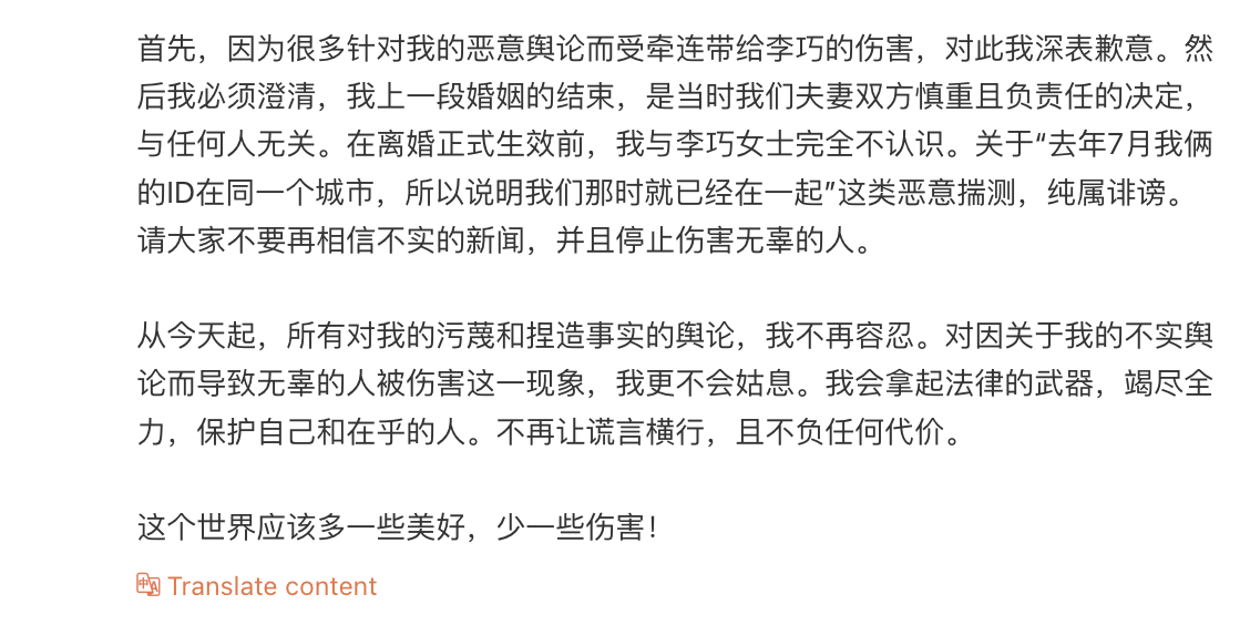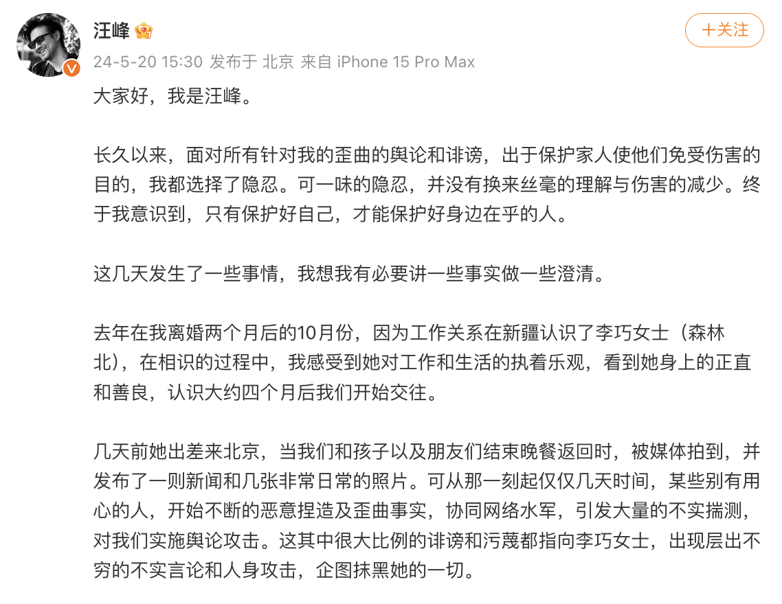 汪峰在微博发长文,回应早前与网红森林北(真名李巧)的恋情传闻,同时辟谣婚内出轨。