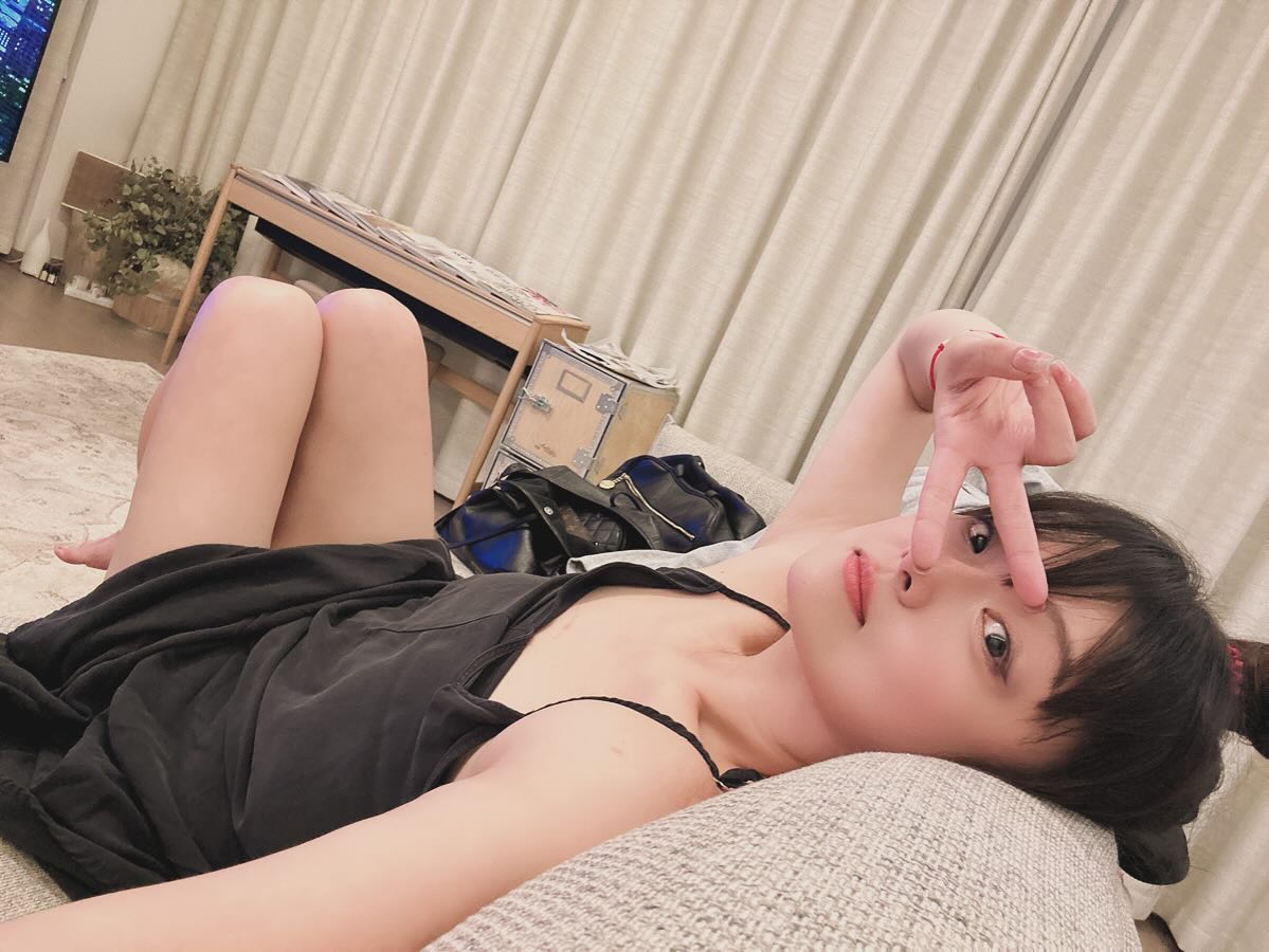 照片中,她身穿黑色吊带裙,像性感睡衣,躺坐在沙发上比V手势自拍,明显可以看到她的锁骨,身形单薄,双腿纤细,下巴尖尖,身材比之前拍婚纱照时更瘦,与过去的样子判若两人。