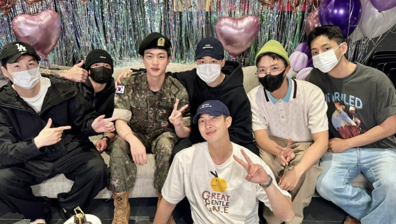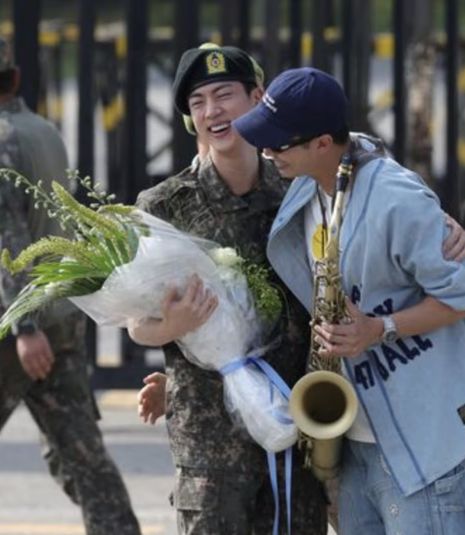 BTS成员近年陆续入伍当兵,Jin(金硕珍)2022年底率先从军后,BTS已1年半没全员合体,Jin在今天退役,除了SUGA其他5人亲自现身迎接,而RM金南俊还现场吹起萨克斯風迎接。