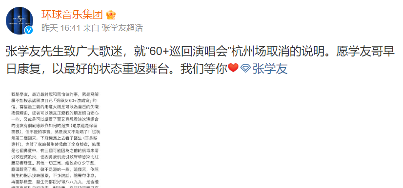 张学友透过所属环球音乐微博发表文告指出,经慎重考虑,现遗憾通知大家,原计划于2024年7月26、27、28日在杭州奥体中心体育馆举办的《张学友60+巡回演唱会》取消。