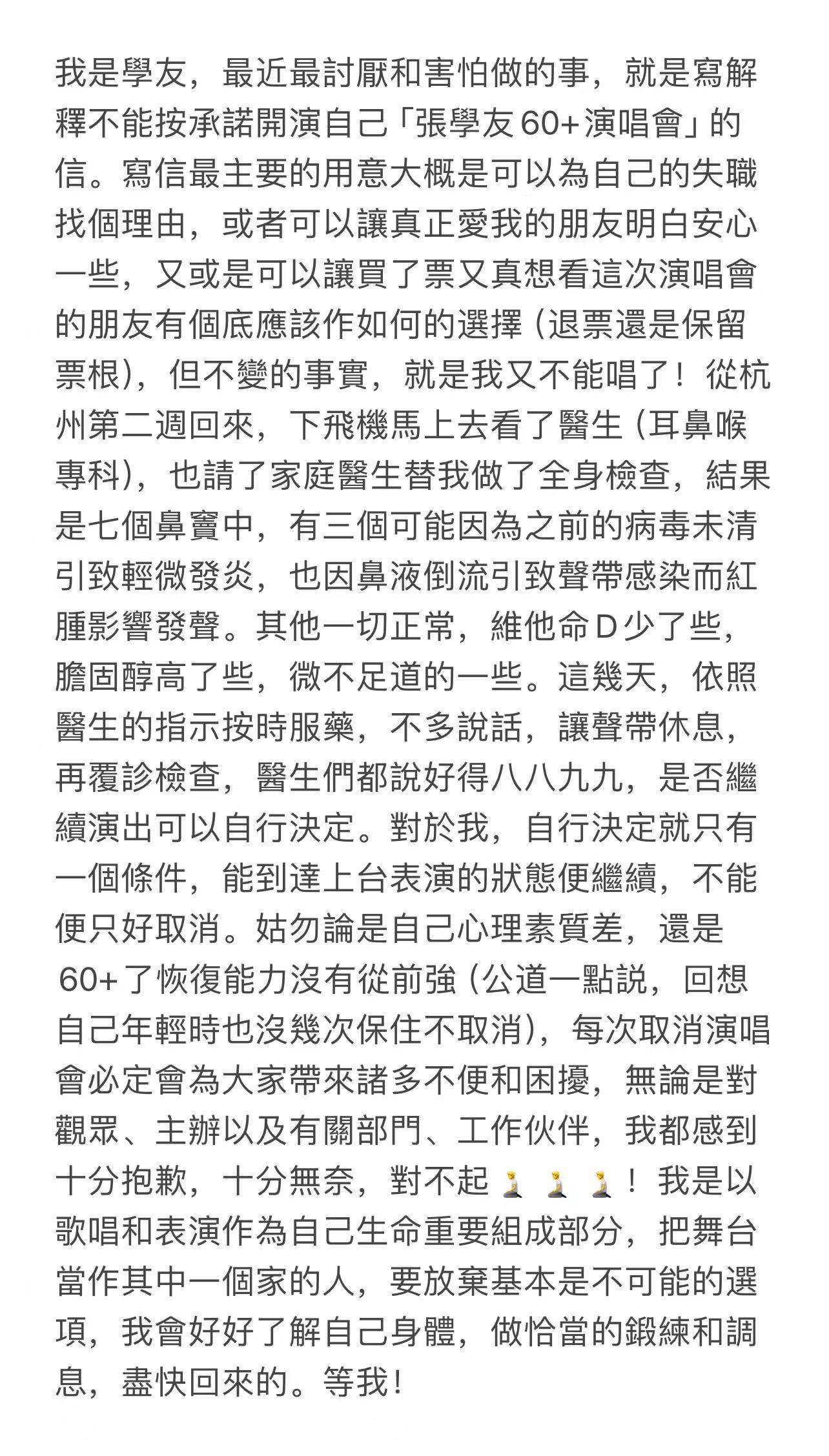 文告表示,这几天依照医生的指示按时服药,不多说话,让声带休息,恢复了八九成,但他说只要能到达上台表演的状态便继续,不能便只好取消。