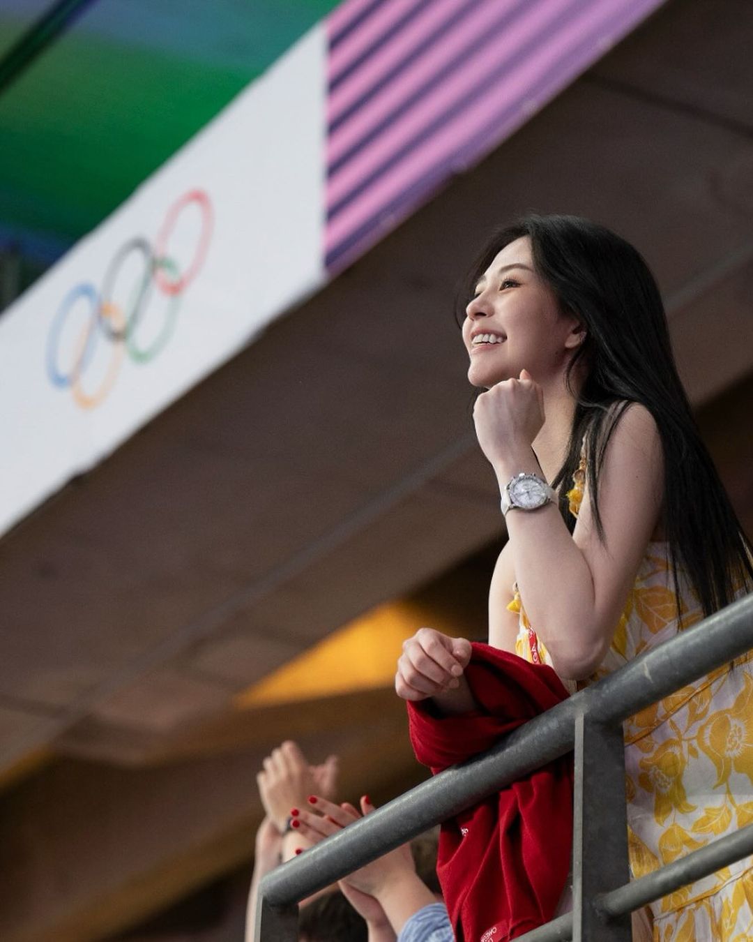 沈月先是在巴黎铁塔下观看沙滩排球比赛,随后又观看了游泳、柔道和七人榄球等比赛,并与家人和朋友们合影留念。
