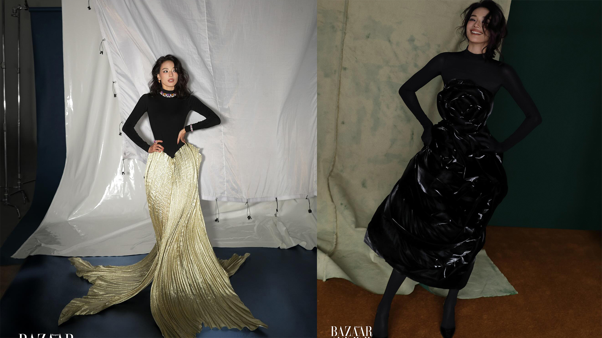 在这次的封面拍摄中,舒淇挑战多套风格迥异的服装。其中,几套平口礼服完美衬托出她的性感锁骨和肩颈线条,搭配浮夸的卷发和代言珠宝,衬托出狂野又迷人的气息。