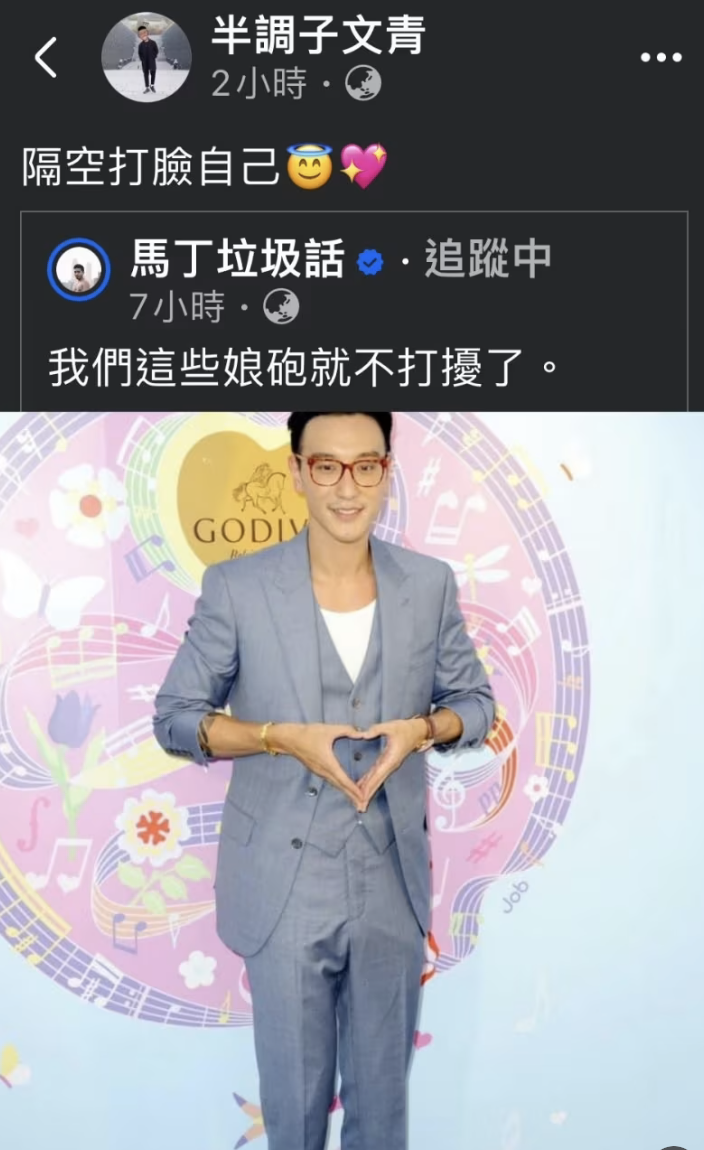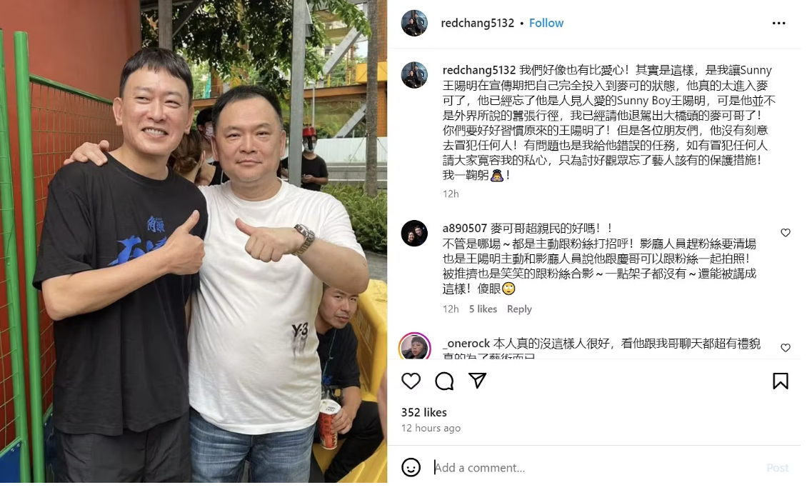 王阳明至今没有就“娘炮论”再发生,不过,《角头》制片张威演则在深夜发文声援:“他没有刻意去冒犯任何人!”