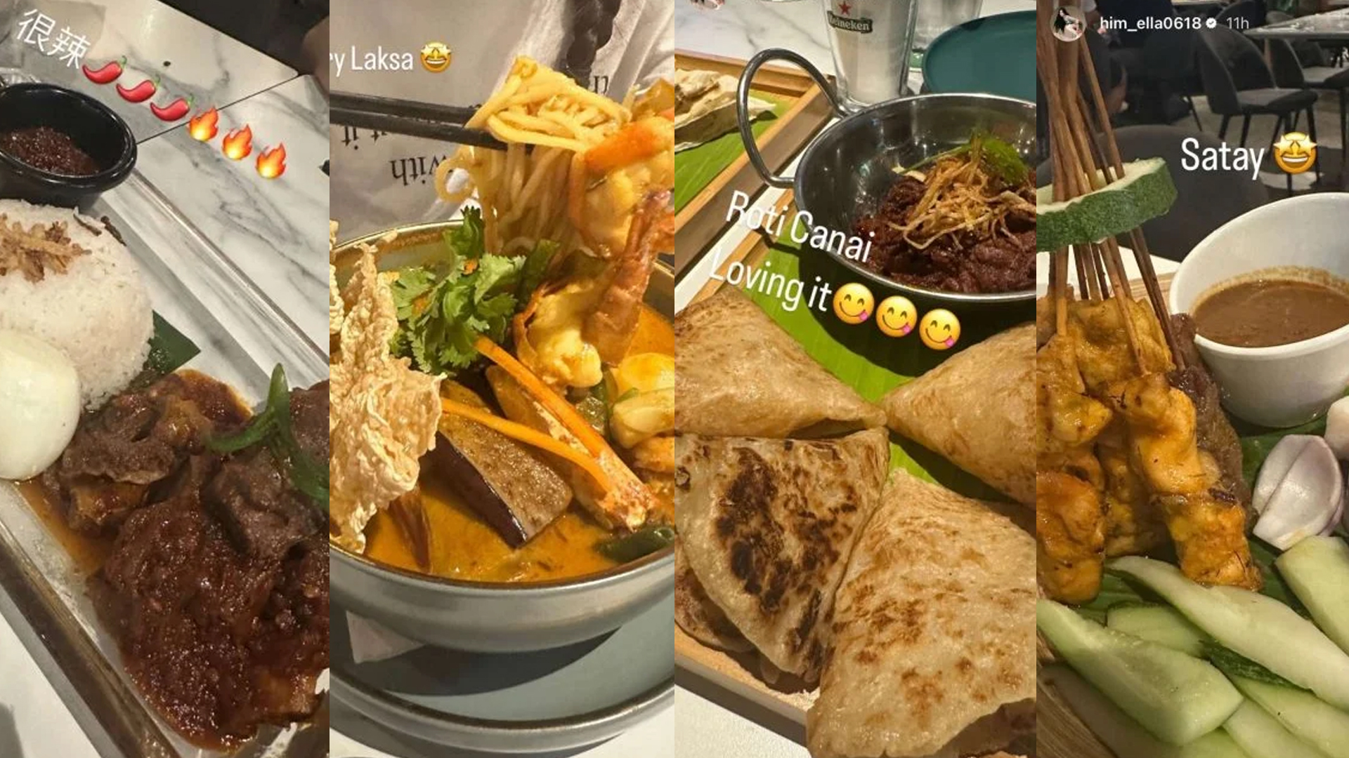 尽管尚不知Ella晚餐的具体内容,但她分享的照片显示,她和劲宝下午尝了沙爹、椰浆饭、咖喱面和印度煎饼,其中她特别提到椰浆饭“很辣”!