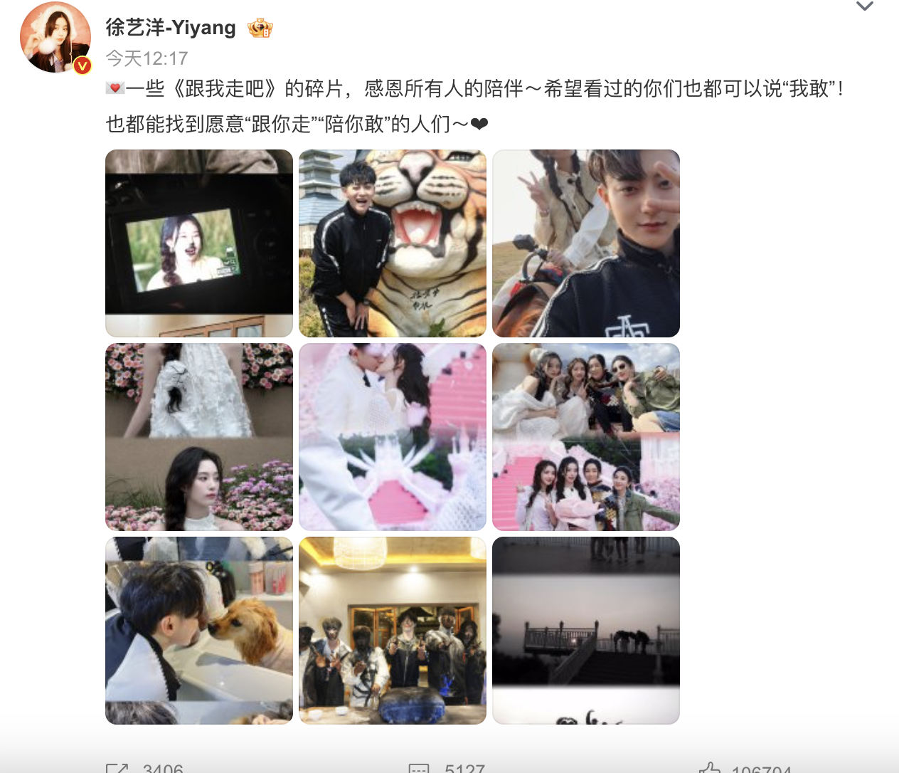 徐艺洋今天也在微博发文:“希望看过的你们也都可以说“我敢”!也都能找到愿意‘跟你走’和‘陪你敢’的人们。”