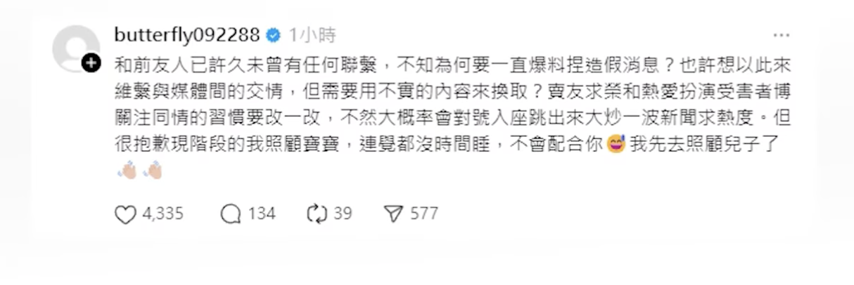 对此,恺乐今天在Threads上发文反击,动怒打脸爆料前友人:“和前友人已许久未曾有任何联系,不知为何要一直爆料捏造假消息?也许想以此来,维系与媒体间的交情,但需要用不实的内容来换取?”