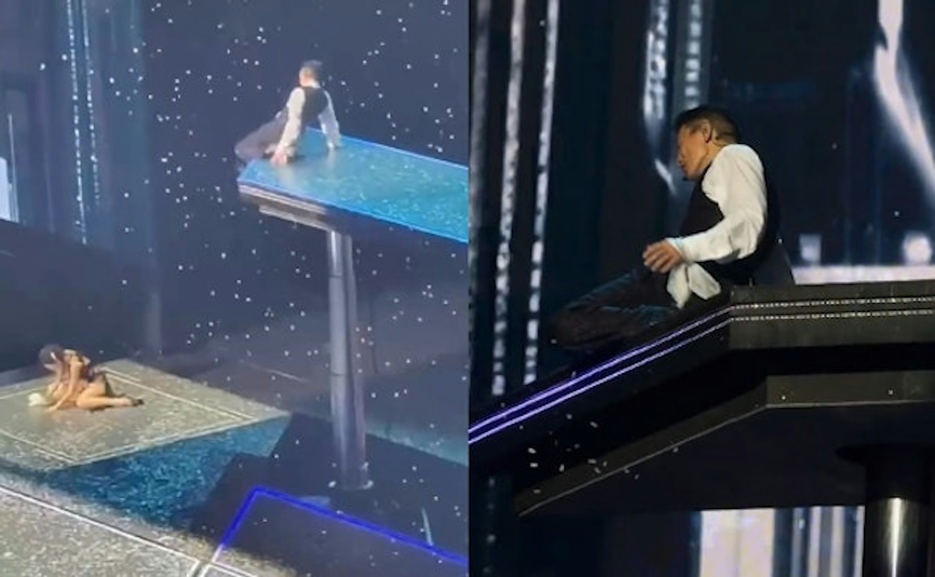 刘德华在踩空跌倒后,在舞台上趴了一下,才缓缓起身笑着跟现场观众说没事,但人在现场歌迷还是被吓着,痛骂主办单位。