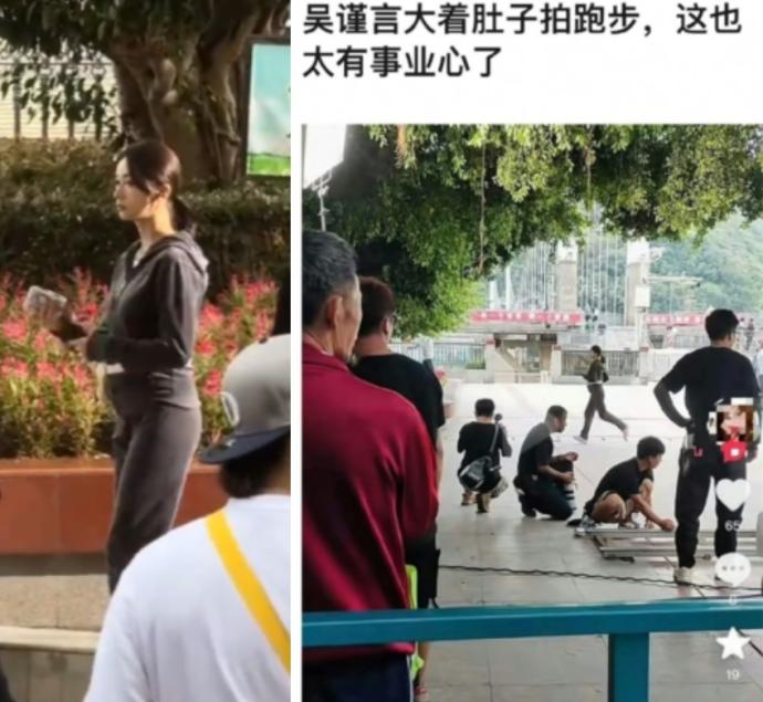 从照片中看到吴谨言正在忙着拍摄,穿着全黑运动服且绑着马尾,看起来应为在公园跑步的戏。但引人注目的是,侧拍照中肚子部分明显隆起,因此,也被网友频说“真的太明显了”,但也有人指称,显然剧中角色为怀孕女性,否则她不但一直没有回应,还很“大方”的出现在公众场合。