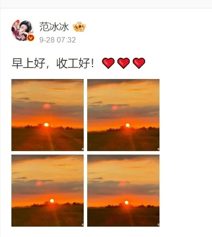 范冰冰在微博先是发布4张稻田边日出照,并写道:“早上好,收工好”,显示她拍到日出才收工,让粉丝留言“早,努力的冰冰姐”、“感谢影后给我们分享的日出”,更有者要求她分享自拍照,“自拍呢宝宝”。