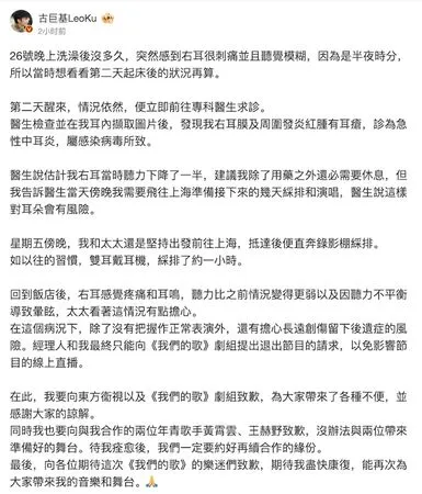 近日频密出现在中国音乐节目的香港著名歌手古巨基,日前出席中国音乐盛典及正在参与录制《我们的歌》的他,却突发患急性中耳炎听力剩下一半,他昨晚官宣不得不退出节目。