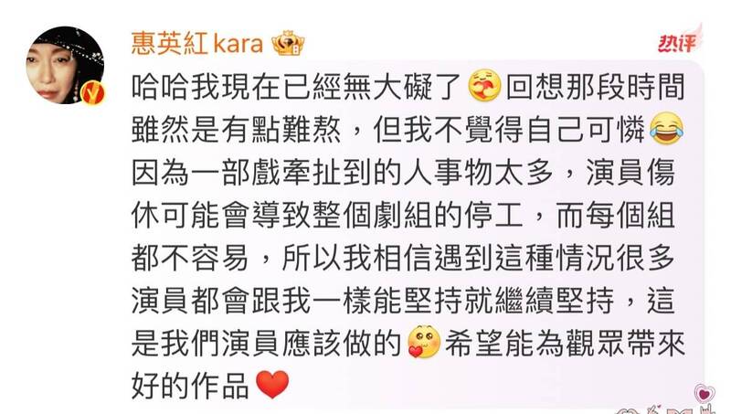 她表示不想拖累剧组,认为演员在遇到这种情况时应该坚持,希望能够为观众带来好的作品。