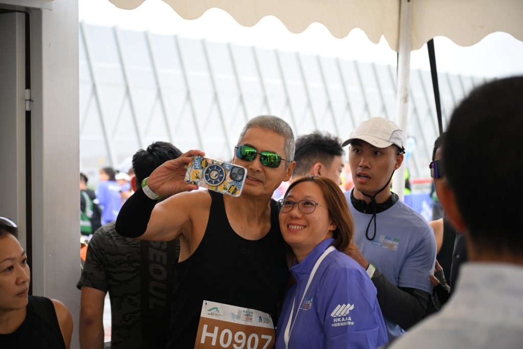 由于赛事在机场跑道举行,跑道两侧的飞机照常起降。周润发笑称:“这里比街头马拉松好,因为人少。”