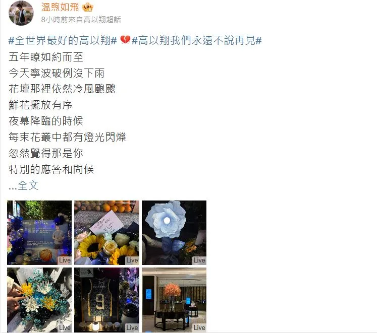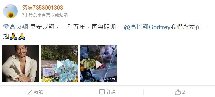 除了陈铭章一早就发文悼念外,高以翔的官方微博也发文写下:“一晃五年,愿另一个世界,也如人间,繁华似锦”,并标注写下“高以翔我们永远不说再见”,令人看了为之动容。